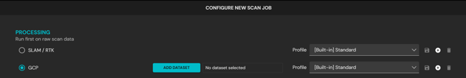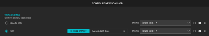 In the Configure New Scan Job panel, select a processing profile for SLAM and a processing profile for GCP.