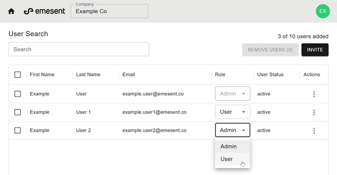 From the Emesent User Management home page, locate the user whose role you want to change.